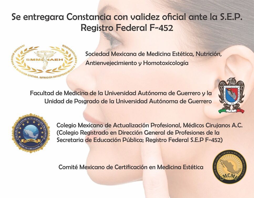 La Sociedad Mexicana de Medicina Estética, Nutrición, Antienvejecimiento y Homotoxicología, La Facultad de Medicina y la Unidad de Posgrado de la Universidad Autónoma de Guerrero, El Colegio Mexicano de Actualización Profesional, Médicos Cirujanos A.C. (Colegio registrado en Dirección General de Profesiones de la Secretaría de Educación Pública; Registro Federal: F452) y el Comité Mexicano de Certificación en Medicina Estética, Le envían un cordial saludo y lo invitan a formar parte del grupo de médicos interesados en la salud y estética de sus pacientes actualizándose en el curso: