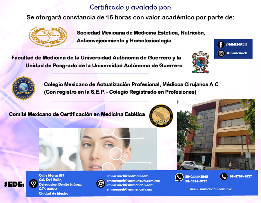 La Sociedad Mexicana de Medicina Estética, Nutrición, Antienvejecimiento y Homotoxicología, La Facultad de Medicina y la Unidad de Posgrado de la Universidad Autónoma de Guerrero, El Colegio Mexicano de Actualización Profesional, Médicos Cirujanos A.C. (Colegio registrado en Dirección General de Profesiones de la Secretaría de Educación Pública; Registro Federal: F452) y el Comité Mexicano de Certificación en Medicina Estética, Le envían un cordial saludo y lo invitan a formar parte del grupo de médicos interesados en la salud y estética de sus pacientes actualizándose en el curso: