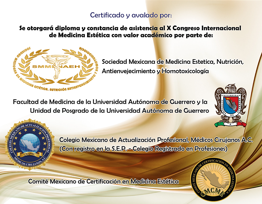 La Sociedad Mexicana de Medicina Estética, Nutrición, Antienvejecimiento y Homotoxicología, La Facultad de Medicina y la Unidad de Posgrado de la Universidad Autónoma de Guerrero, El Colegio Mexicano de Actualización Profesional, Médicos Cirujanos A.C. (Colegio registrado en Dirección General de Profesiones de la Secretaría de Educación Pública; Registro Federal: F452) y el Comité Mexicano de Certificación en Medicina Estética, Le envían un cordial saludo y lo invitan a formar parte del grupo de médicos interesados en la salud y estética de sus pacientes actualizándose en el diplomado: