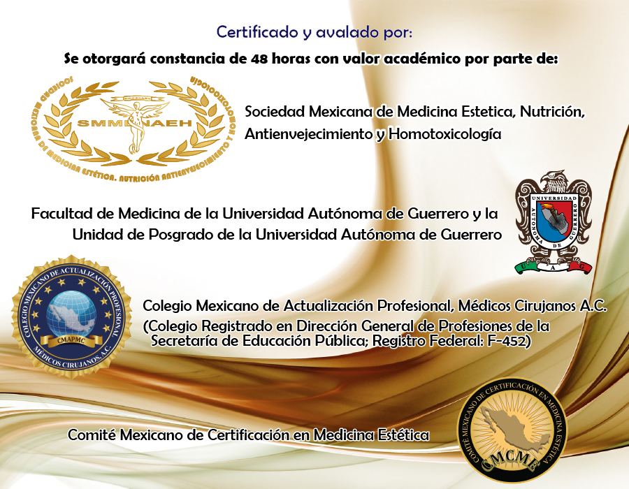 La Sociedad Mexicana de Medicina Estética, Nutrición, Antienvejecimiento y Homotoxicología, La Facultad de Medicina y la Unidad de Posgrado de la Universidad Autónoma de Guerrero, El Colegio Mexicano de Actualización Profesional, Médicos Cirujanos A.C. (Colegio registrado en Dirección General de Profesiones de la Secretaría de Educación Pública; Registro Federal: F452) y el Comité Mexicano de Certificación en Medicina Estética, Le envían un cordial saludo y lo invitan a formar parte del grupo de médicos interesados en la salud y estética de sus pacientes actualizándose en el curso: